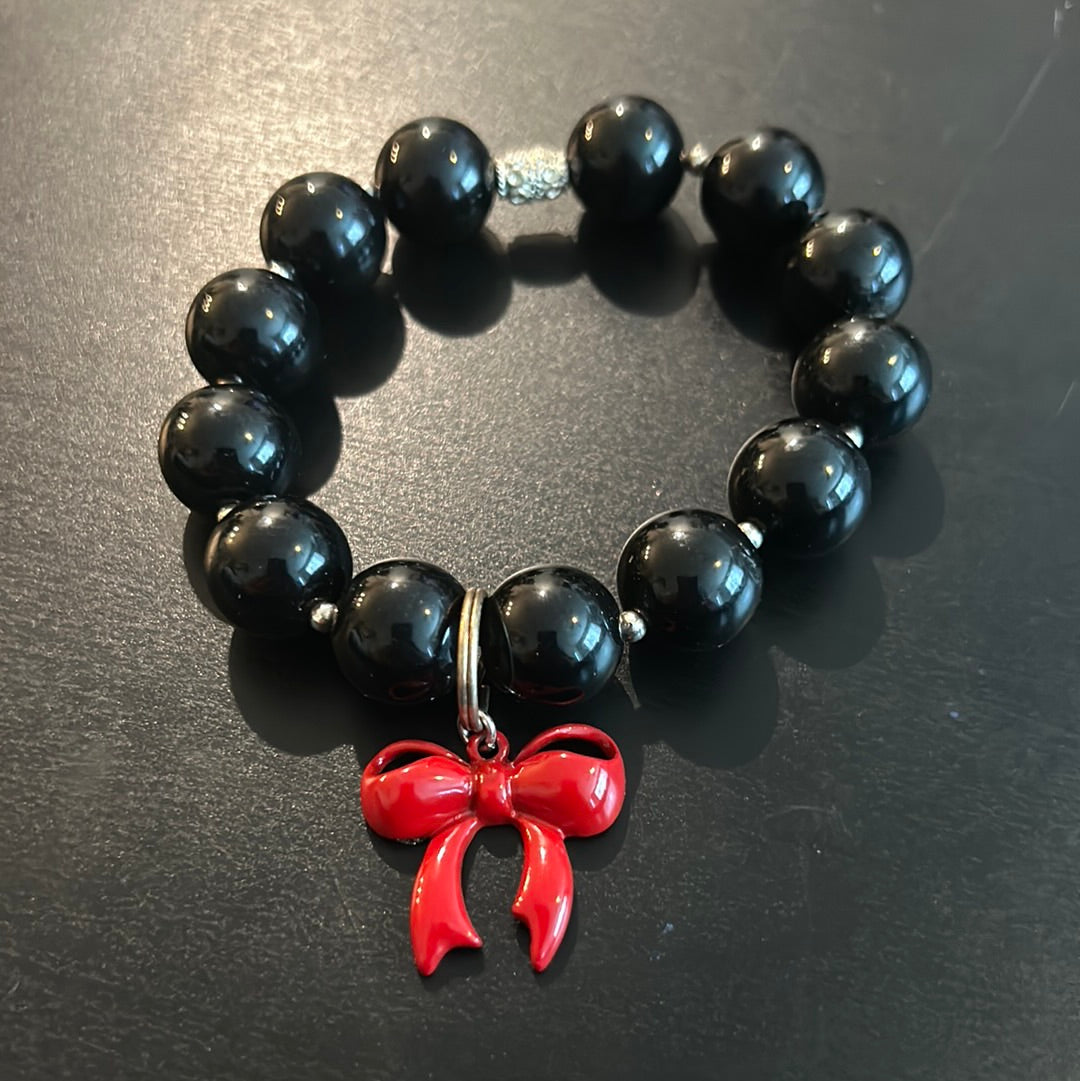 Black beads w/Cute Red Bow stretch bracelet