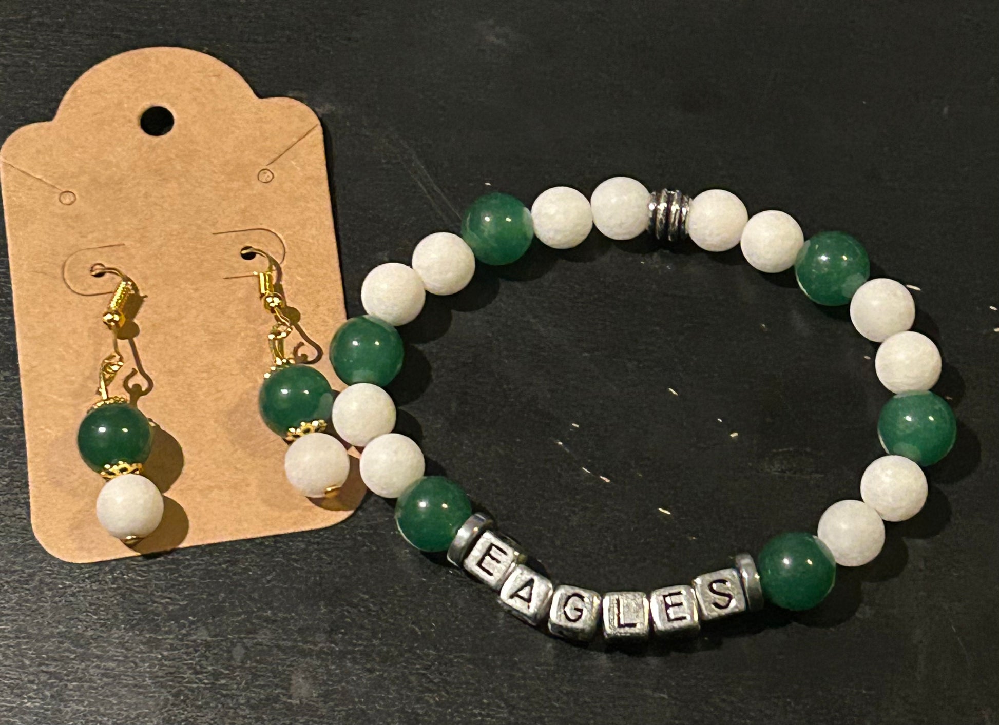Dark Green & White “Philadelphia Eagles” bracelet/earrings Set